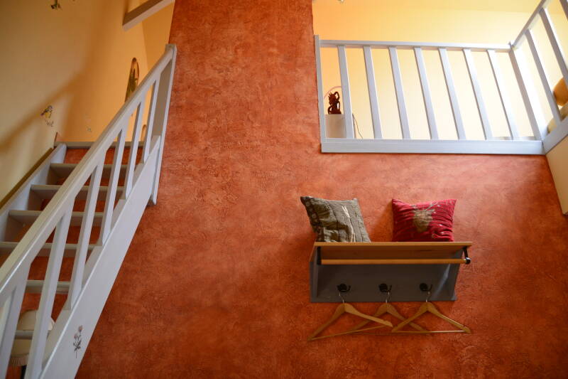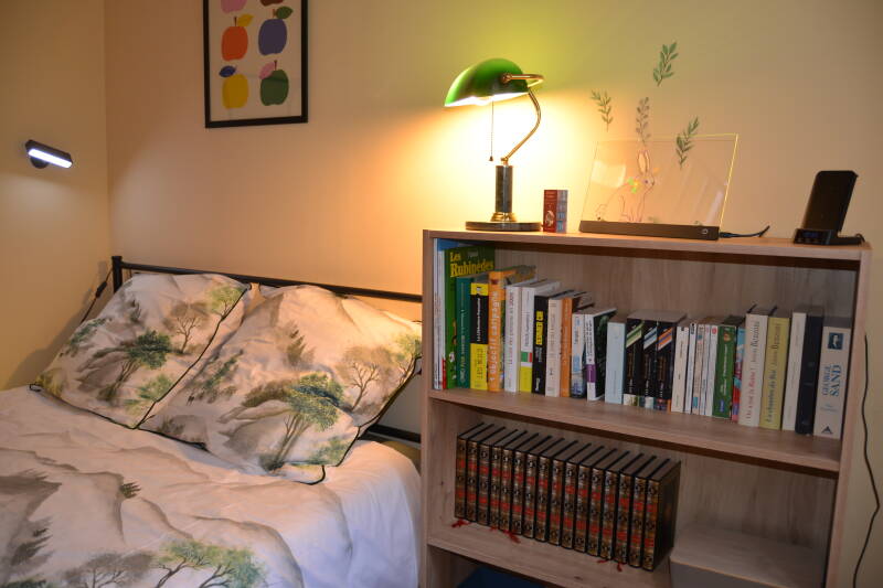 La chambre est équipée d’un grand lit confortable (140x200), de deux lampes de chevet avec une petite table de nuit, ainsi que d’une commode pour ranger vos affaires. Un portant à vêtements fixé au mur et un miroir vertical sont également à disposition. Les amateurs de lecture apprécieront la petite bibliothèque contenant différents ouvrages. Vous trouverez aussi une petite lampe amovible, un chargeur induction pour téléphone, ainsi qu’une plaque en Plexiglas lumineuse sur laquelle vous pouvez laisser un mot ou un dessin. Une enceinte en bois naturel fonctionnant sans électricité complète l’équipement, en accord avec l’esprit nature de la chambre.