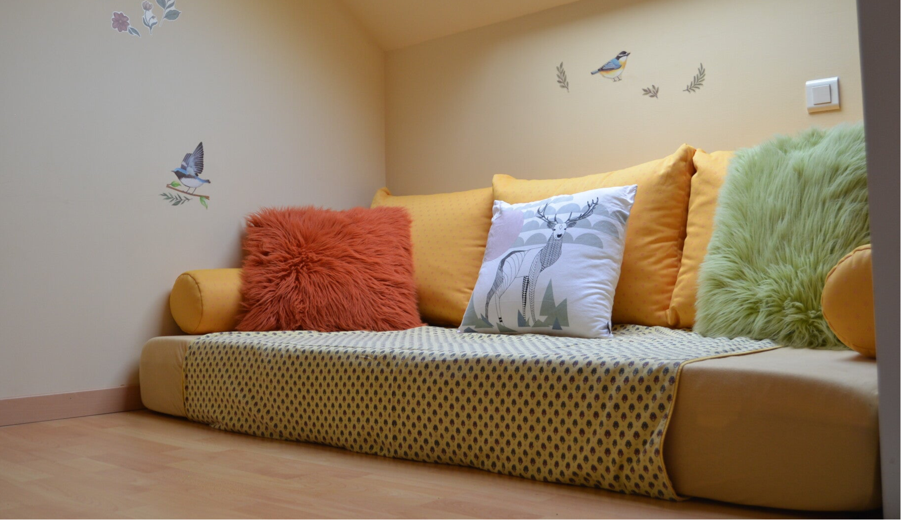 La chambre Forêt vous plonge dans une ambiance douce et enveloppante inspirée de la nature. Ses couleurs légèrement plus profondes évoquent l’atmosphère apaisante de la forêt, tandis que quelques illustrations murales d’oiseaux viennent compléter cette décoration naturelle et chaleureuse.