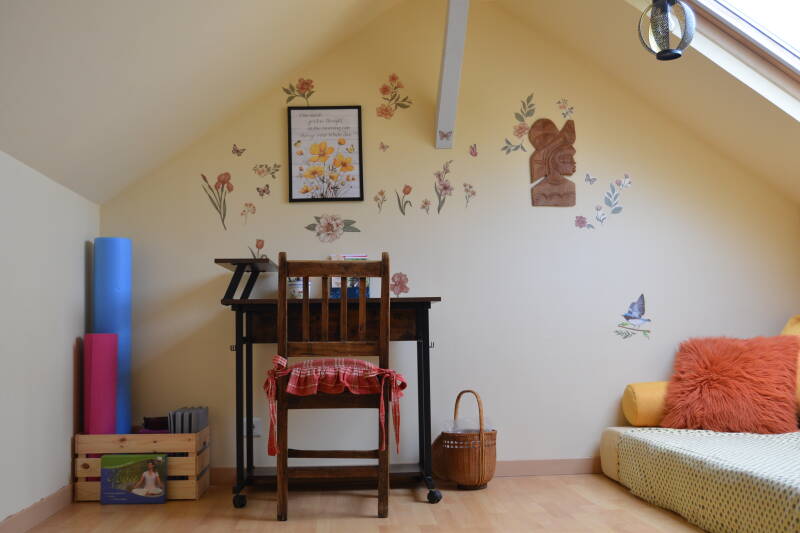 La chambre Forêt vous accueille dans une atmosphère sobre et chaleureuse. Les amateurs de lecture apprécieront les livres mis à leur disposition. Son atout majeur est sa mezzanine dédiée au yoga, à la relaxation, à la lecture ou encore au télétravail, offrant un espace calme et inspirant avec vue sur la terrasse et le clocher de l'église. Un lieu parfait pour allier bien-être et productivité. Vous pourrez retrouver un chargeur à induction pour votre téléphone ainsi qu'une enceinte dans la mezzanine.